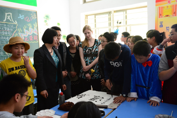 隨后,Emily校長觀看了學生書法、國畫、勾勒臉譜的現(xiàn)場演示,對于中國傳統(tǒng)文化表現(xiàn)出濃厚的興趣。同學們把各自作品送給Emily校長作為紀念,Emily愉快地接受,并與同學們開心地與同學們合影。